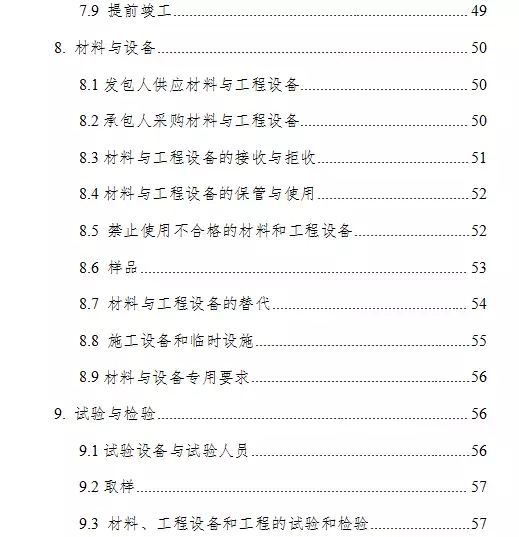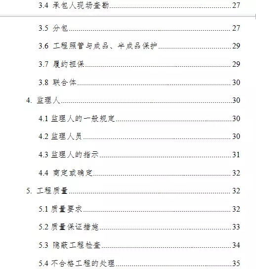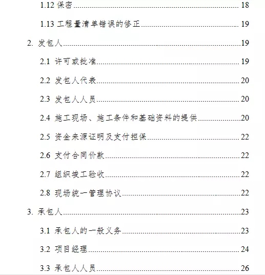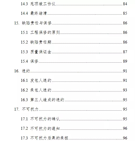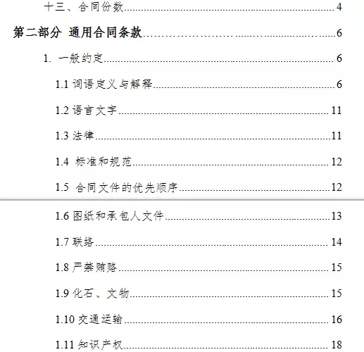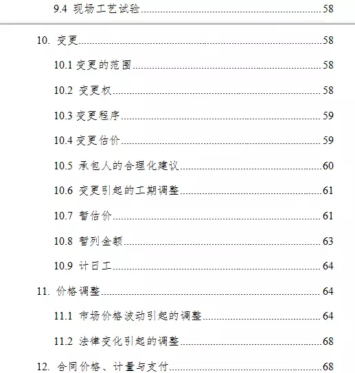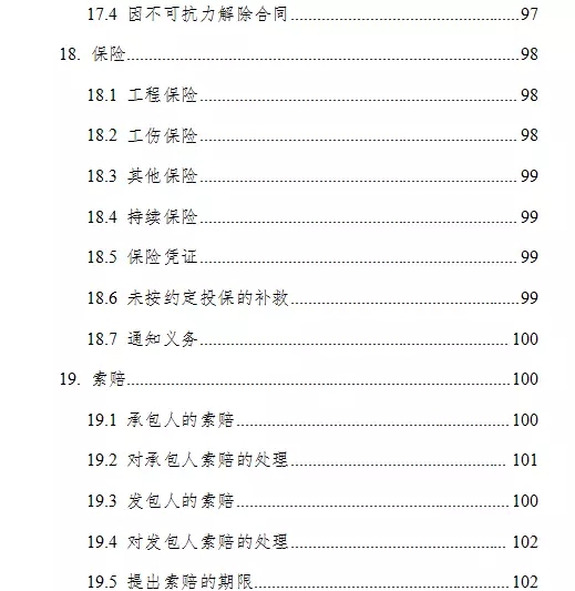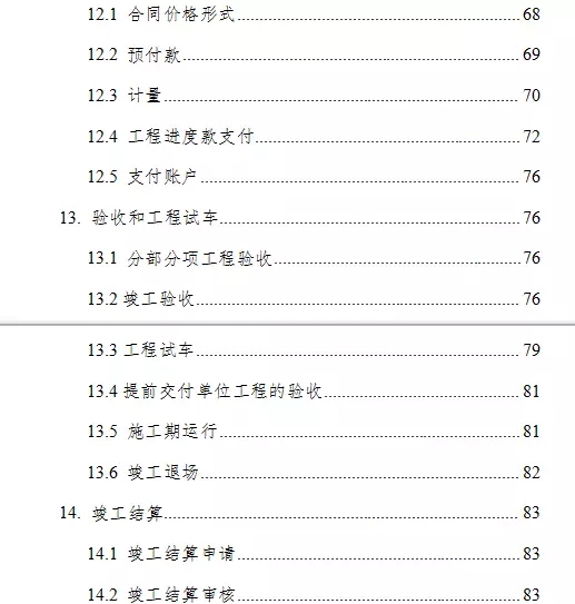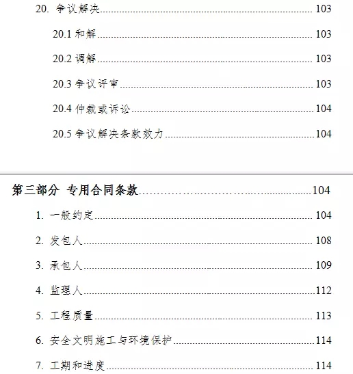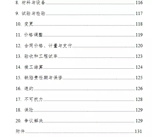 通用合同条款共计20条,具体条款分别为:一般约定、发包人、承包人、监理人、工程质量、安全文明施工与环境保护、工期和进度、材料与设备、试验与检验、变更、价格调整、合同价格、计量与支付、验收和工程试车、竣工结算、缺陷责任与保修、违约、不可抗力、保险、索赔和争议解决。前述条款安排既考虑了现行法律法规对工程建设的有关要求,也考虑了建设工程施工管理的特殊需要。