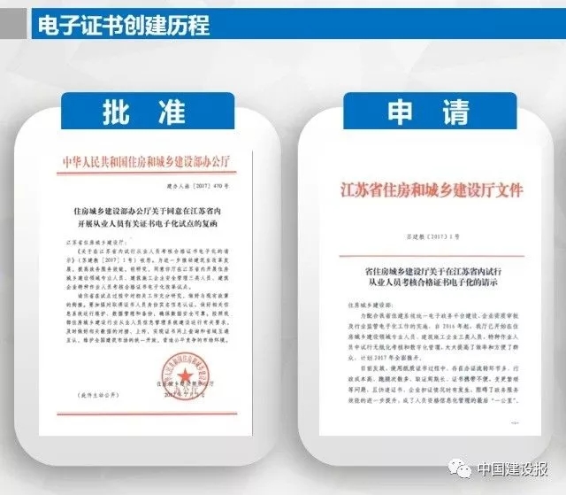 2017年7月7日,住建部批准江苏省住房城乡建设厅率先试行行业从业人员考核合格证书电子化试点。