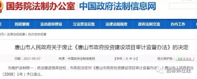 为维护法制统一,依法推进简政放权,市政府决定对《唐山市政府投资建设项目审计监督办法》(唐山市人民政府令〔2008〕1号)予以废止。